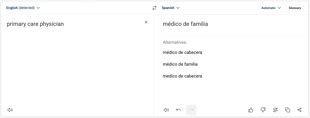 A case we often see in the healthcare space involves the machine translation of patient intake forms. In one example, “primary care physician” was translated as “médico de familia.” While this is a recognized figure in many Latin American countries and Spain, it doesn’t always reflect how care is delivered in the U.S.